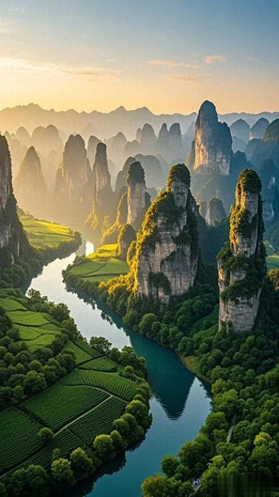 旭日初升金染顶,恍如仙境落人家。