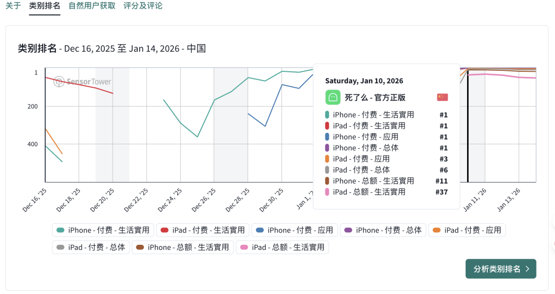 sensor tower的数据显示,1月10日“死了么”占领苹果手机付费下载排行榜第一