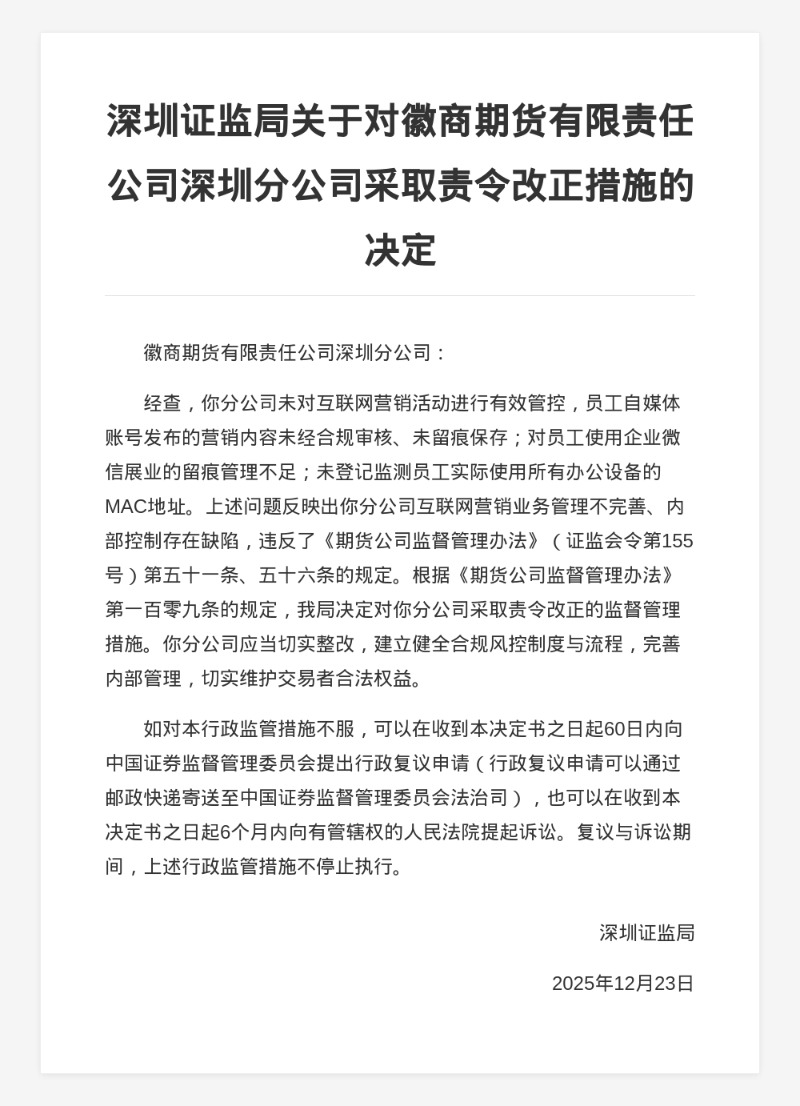 对此,深圳证监局决定对徽商期货有限责任公司深圳分公司采取责令改正的监督管理措施。